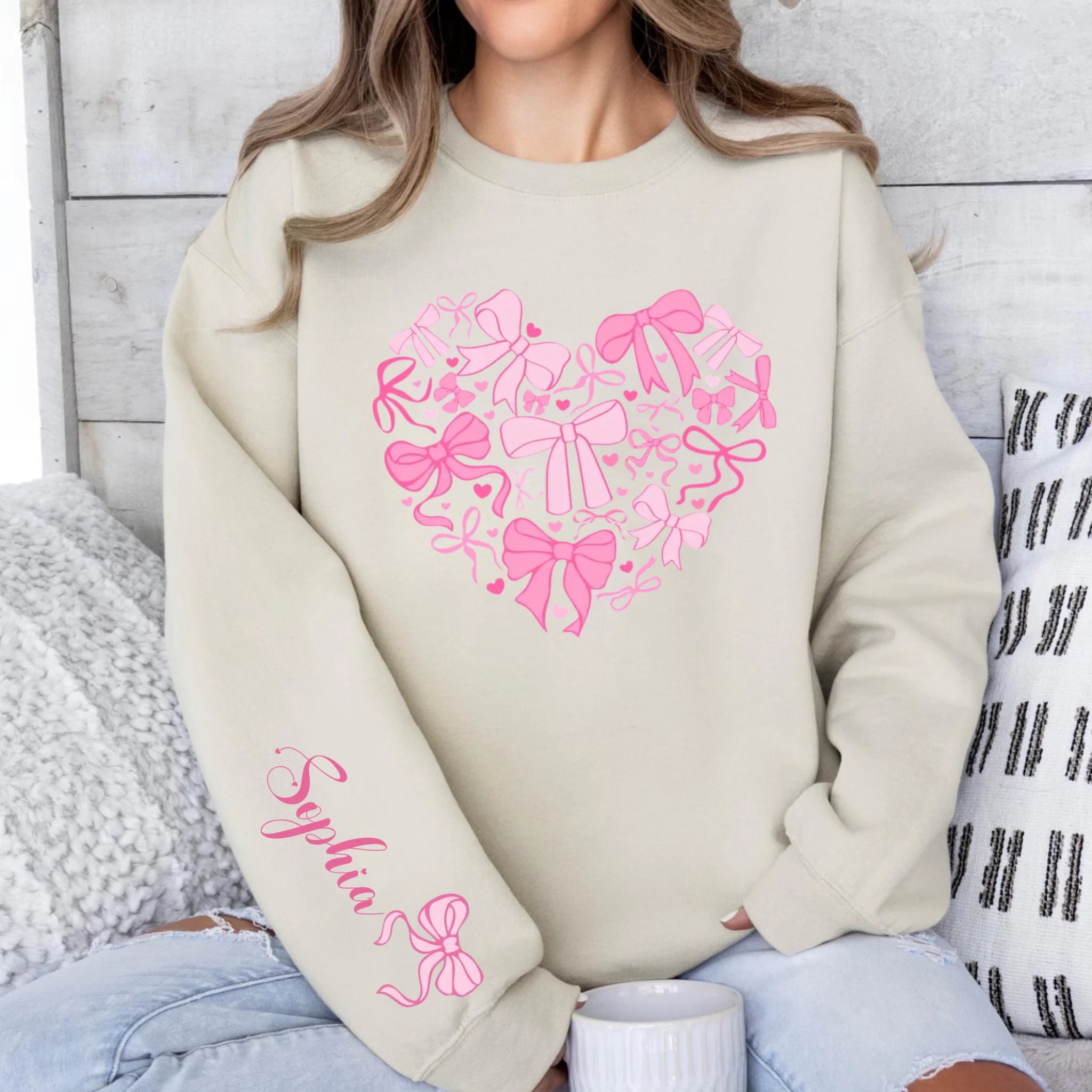Personalized Pink Coquette Valentine Heart Sweatshirt With Custom Name On Sleeve
